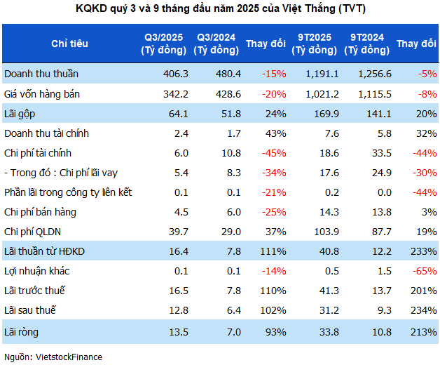 For the first nine months of 2025, Viet Thang’s net revenue reached over VND 1,191 billion, a 5% decrease year-over-year, but net profit surged by 213% to nearly VND 34 billion. The company has nearly achieved its annual revenue target of VND 1,200 billion and slightly exceeded its profit goal by 9%. This nine-month profit is the highest in the last three years, even surpassing the full-year profits of 2023 and 2024, which were challenging years for the textile industry due to global economic recession and inflation-driven order declines.
