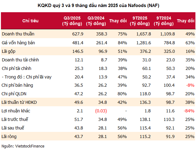In Q3/2025, Nafoods recorded a revenue of nearly VND 628 billion, a 75% increase compared to the same period last year. Net profit reached VND 44 billion, up 56%. For the first nine months, revenue totaled nearly VND 1,658 billion, and net profit exceeded VND 115 billion, marking a 49% and 25% rise, respectively. These results signify that the company has achieved 84-85% of its annual revenue and profit targets.