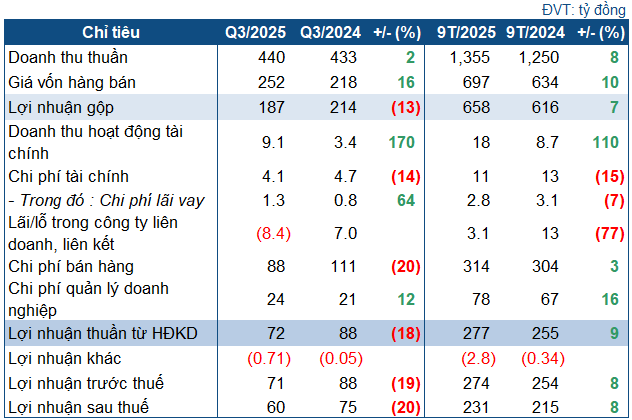 In Q3, DBD’s net revenue reached VND 440 billion, a slight increase year-over-year. However, the cost of goods sold surged by 16% to over VND 252 billion, causing gross profit to decline by 13% to VND 187 billion.