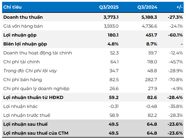 According to the Q3/2025 financial report, the company recorded net revenue of over VND 3,770 billion, a 27% decrease compared to the same period last year. Net profit reached VND 49.5 billion, down nearly 24%.