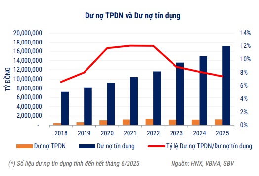 In Q3 2025, Vietnam witnessed 10 public bond issuances totaling over VND 20 trillion, accounting for nearly 16% of the total issuance value. Additionally, there were 119 private placements worth nearly VND 109 trillion, making up more than 84%. The bond market’s size relative to GDP stood at 10.2% by the end of Q3, a slight decrease from 10.25% at the end of 2024.