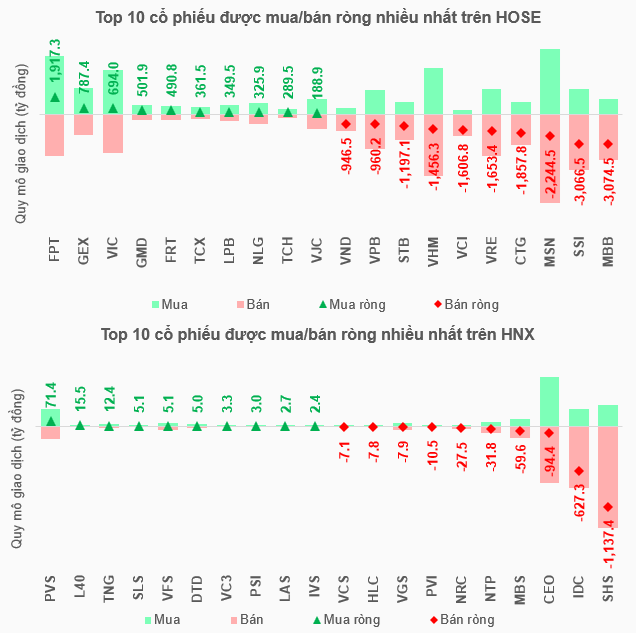 Eight stocks recorded net selling of thousands of billions, led by MBB and SSI, both exceeding 3 trillion VND. Following closely were MSN, CTG, VRE, VCI, VHM, and STB.