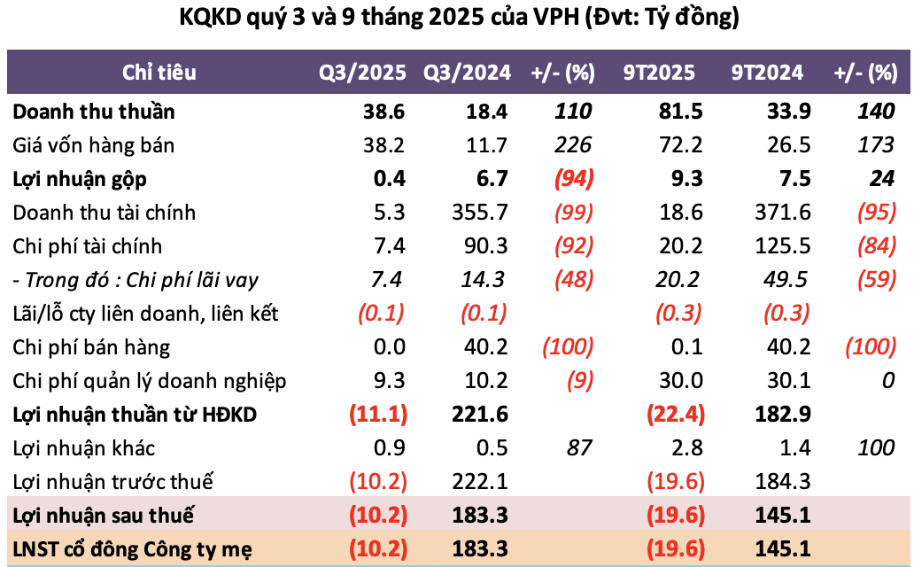 Over the first nine months, net revenue reached nearly VND 82 billion, 2.4 times higher than the same period last year. However, the company incurred a net loss of nearly VND 20 billion. Beyond the continued losses, VPH also reported a negative operating cash flow of over VND 480 billion, primarily due to a VND 415 billion increase in receivables.