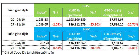 The stock market entered a subdued trading week in late October. Both indices and liquidity declined across the two listed exchanges. On the Ho Chi Minh Stock Exchange (HOSE), the VN-Index fell by 2.6% to nearly 1,640 points. The Hanoi Stock Exchange (HNX-Index) saw a 0.5% decrease, closing at 265.85 points.