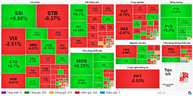 The financial and non-essential consumer sectors faced strong selling pressure, with notable declines in VIX (-2.33%), STB (-1.11%), VPB (-1.86%), SHB (-0.92%), MWG (-1.71%), HAX (-1.38%), and PET (-0.83%).