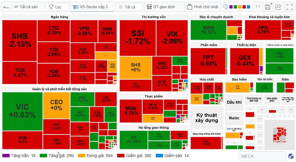 Securities stocks like VIX (-2.96%), SSI (-1.58%), SHS (-1.77%), VND (-1.25%), and HCM (-1.3%) declined. Banking stocks also fell, with TCB (-1.32%), HDB (-1.93%), VPB (-1.37%), and STB (-1.68%) leading.