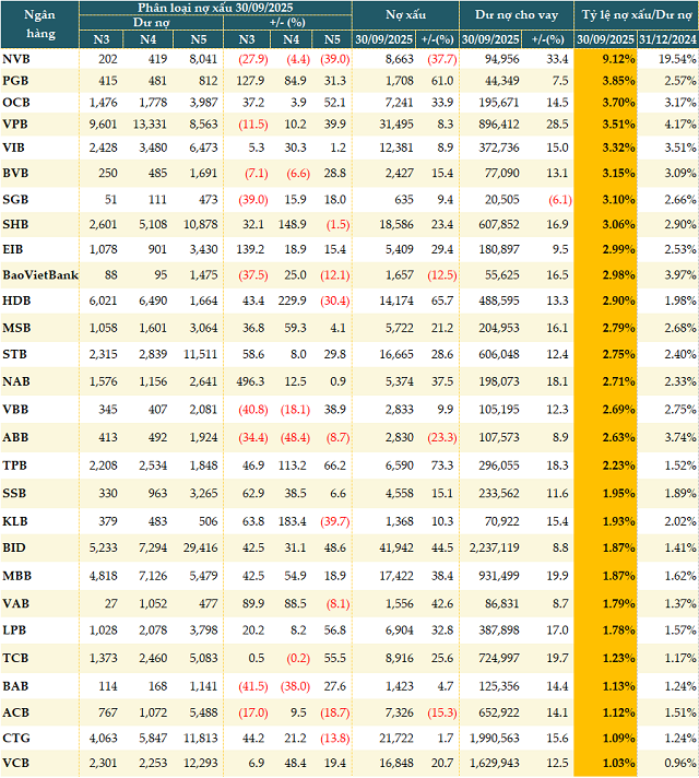 Loan Quality of Banks as of September 30, 2025 (Unit: Billion VND)
