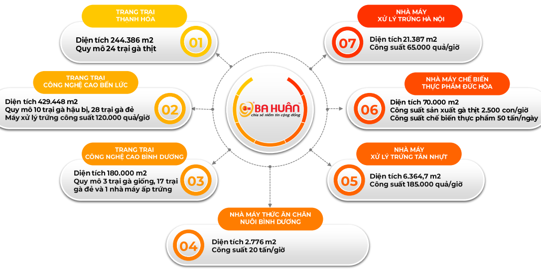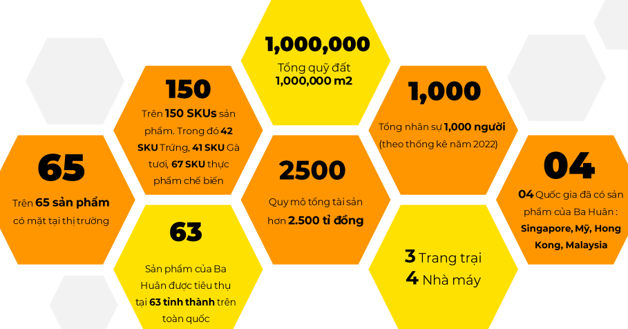 Ba Huân is a renowned and long-standing brand in the consumer market, primarily known for its “Ba Huân” chicken eggs. The company operates three factories: Duc Hoa Food Factory (formerly in Long An), Hanoi Egg Processing Factory, and Binh Chanh Egg Processing Factory, along with three farms in Binh Duong and the former Long An (Ben Luc and Thanh Hoa).