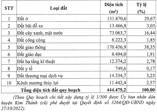 The total land area is over 444,475 m², with residential land accounting for nearly 30%, commercial services over 3%, transportation land 38%, and green spaces and water bodies over 16%.