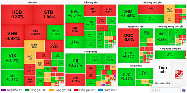 Red dominated the financial sector from the opening bell. Leading stocks declined negatively from the start, including SHB (-1.22%), SSI (-0.57%), and STB (-0.51%).