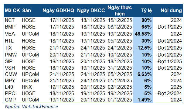 The standout company for the upcoming week is NCT, offering an impressive 80% dividend rate. The ex-dividend date is November 17, with payment scheduled for December 15. With approximately 26.2 million outstanding shares, the total dividend payout is estimated at over 209 billion VND. This rate was approved during the 2025 Annual General Meeting in June.
