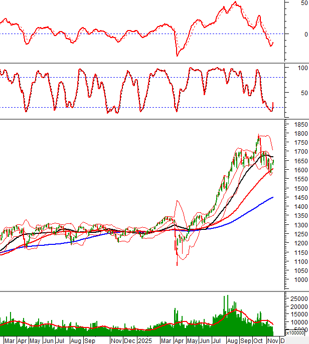 During the morning trading session on November 17, 2025, the VN-Index continued its upward trend, surpassing the Middle line of the Bollinger Bands.