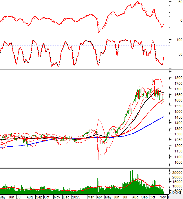 During the morning trading session on November 18, 2025, the VN-Index continued its upward trend for the third consecutive session, decisively breaking through the Middle line of the Bollinger Bands. This threshold is expected to act as a support level in the near future.