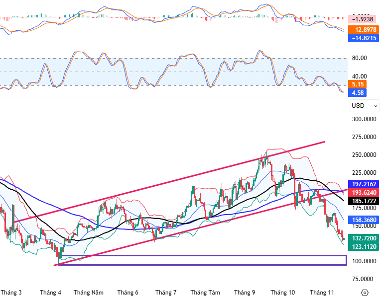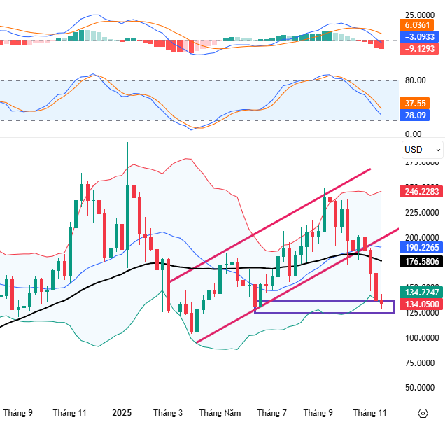 The price remains near the Bollinger Bands’ lower band, while the MACD shows lower highs and lower lows. If the $125-$137 support is breached, the likelihood of retesting the April 2025 lows ($95-$108), also the 52-week bottom, will increase significantly.