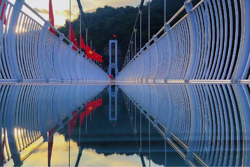 The walkway is crafted from Saint-Gobain’s (France) ultra-strong glass, comprising 3 layers with a total thickness of 40mm. The bridge measures 2.4 meters wide, narrowing to 1.5 meters where it clings to the cliffside.