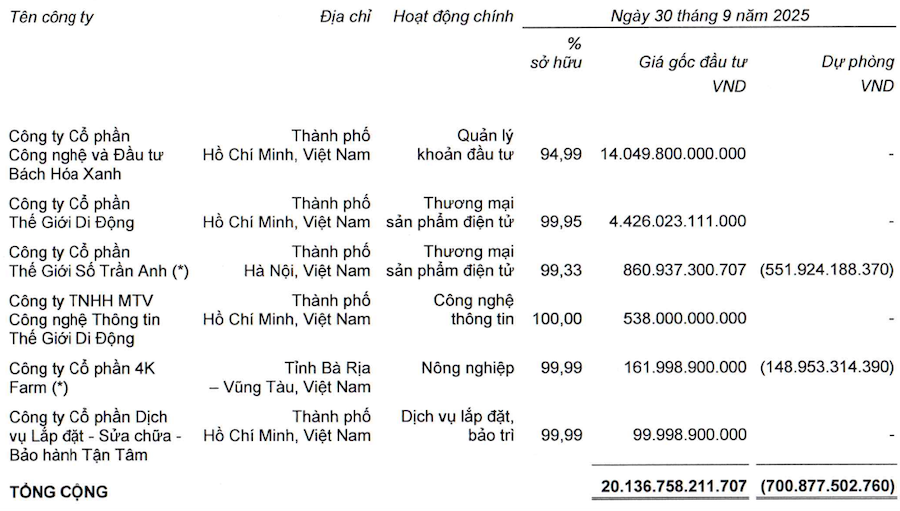 As of September 30, 2025, MWG has six subsidiaries with a total investment value of 20,137 billion VND. Provisions of over 700 billion VND have been set aside, primarily for Tran Anh Digital World Joint Stock Company (552 billion VND) and 4k Farm Joint Stock Company (149 billion VND).