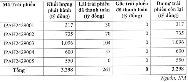 With this latest issuance, I.P.A now has six outstanding bond series listed on the Hanoi Stock Exchange (HNX), totaling VND 4,714 billion. These include the newly issued IPA12501 series and the IPAH2429001 to IPAH2429005 series issued in 2024, all with a 9.5% interest rate and maturing between June and December 2029. Specifically, the IPAH2429001 series, valued at VND 317 billion, is used to restructure existing loan agreements and other liabilities of IPA; the remaining four series are allocated for restructuring the company’s debts, including loans, bonds, and other liabilities.