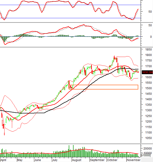 During the morning trading session on November 21, 2025, the VN-Index declined, dropping below the Middle line of the Bollinger Bands.