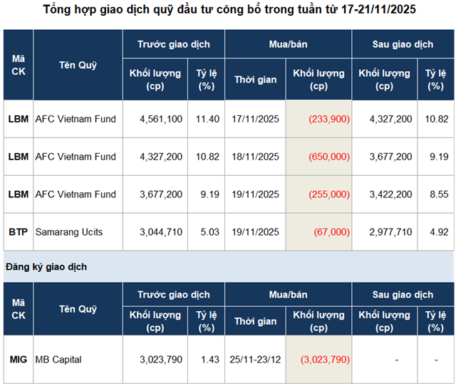 The AFC Vietnam Fund has notably offloaded shares of LBM (Lam Dong Minerals and Construction Materials JSC) in a series of transactions to rebalance its portfolio. The fund sold 233,900 shares on November 17, 650,000 shares on November 18, and 255,000 shares on November 19. Over these three sessions, AFC reduced its ownership in LBM from 11.4% to 8.55%, equivalent to nearly 3.4 million shares. Based on the closing prices during these sessions, the fund is estimated to have generated approximately VND 43 billion.