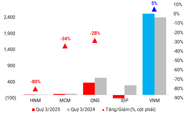 Hanoi Dairy (UPCoM: HNM) also faced a bleak quarter, with revenue plunging 29% to VND 153 billion due to declining contract manufacturing orders. This marks the fifth consecutive quarter of revenue decline for HNM. Net profit barely reached VND 2 billion, an 80% drop and the lowest since 2021.