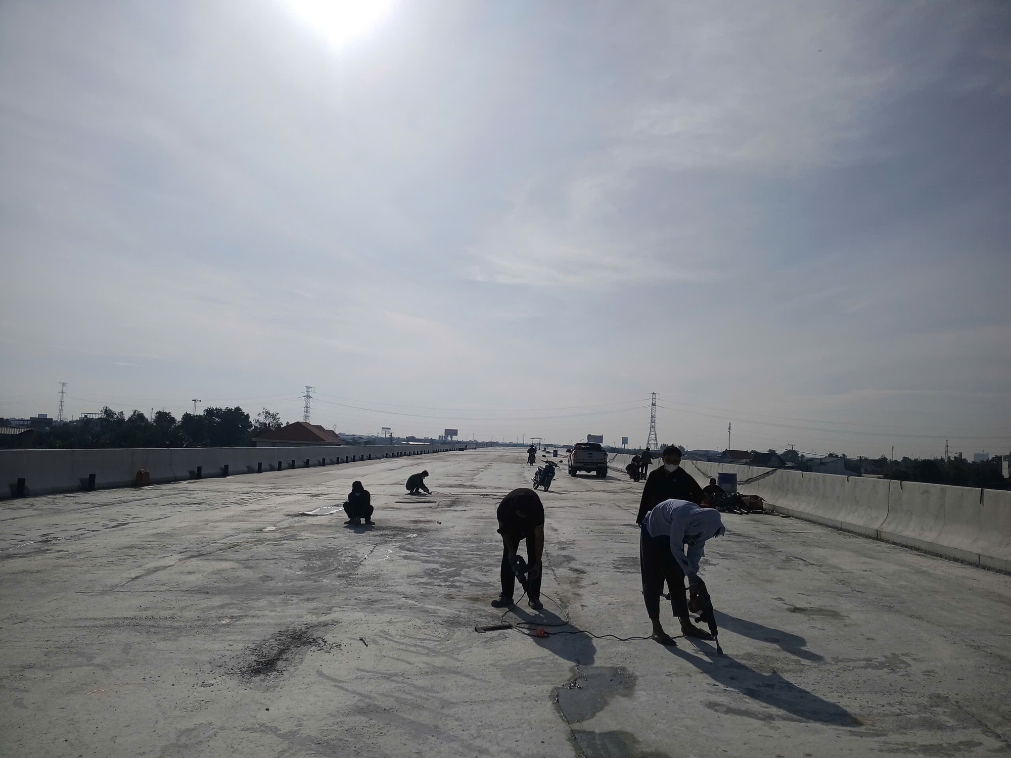 Dozens of workers are diligently cleaning the bridge surface in preparation for asphalt paving.