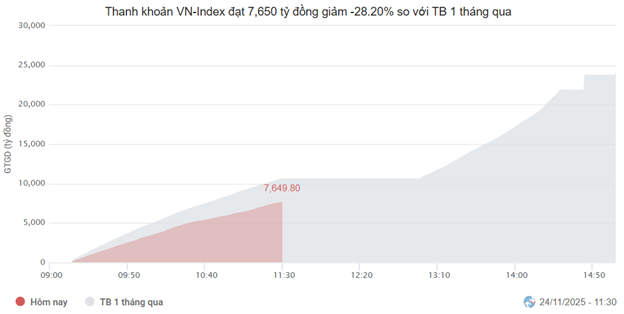 In contrast, VJC (+4.06%) and VNM (+5.01%) surged impressively toward the end of the morning session, helping to stabilize the benchmark index around 1,665 points. These were also the two stocks actively bought by foreign investors, despite their overall net selling pressure reaching VND 804 billion across all three exchanges in the morning session of November 24.