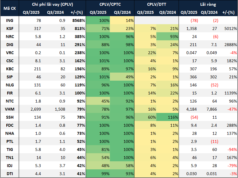 Companies with significant debt increases, such as KSF and KBC, also saw interest expenses rise sharply, with KSF’s expenses increasing ninefold to VND 317 billion and KBC’s nearly tripling to VND 211 billion in Q3/2025.