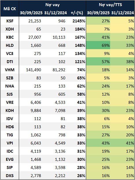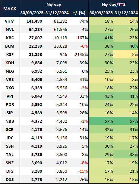 Top 20 Real Estate Companies with the Largest Debt Increase in the First 9 Months of 2025 (Unit: Billion VND)