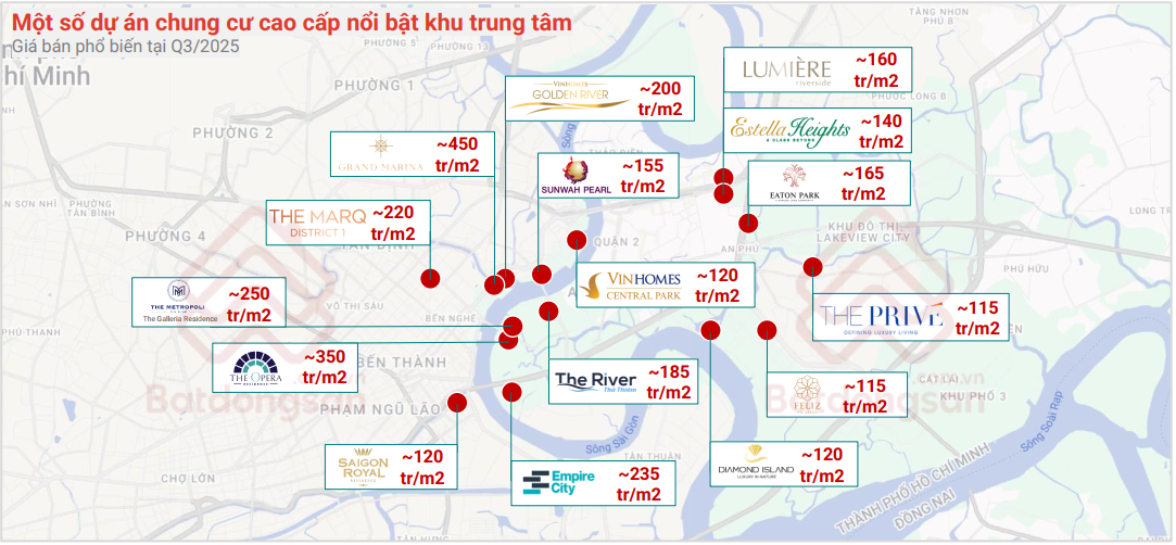 In a recent report by Batdongsan.com.vn, a notable price differentiation has been observed among several high-end condominium projects in the central areas of Ho Chi Minh City.