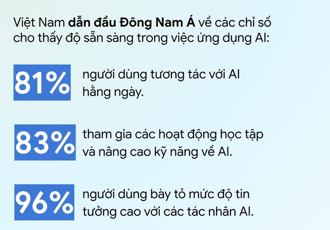 The report also positions Vietnam as a leader in Southeast Asia regarding user readiness and trust in AI. This is evidenced by three key indicators: 81% of users interact with AI tools and features daily; 83% engage in AI learning and skill enhancement activities; and notably, 96% are willing to share data access with AI agents.