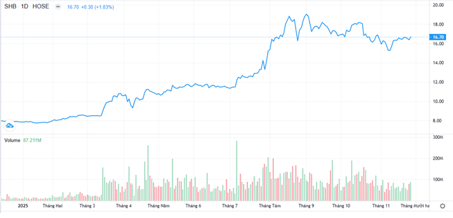 Year-to-date, SHB shares have surged 110% to VND 16,700, with average daily liquidity of 70-80 million shares and sessions exceeding 100 million. SHB‘s P/B ratio of 1.16x is compelling relative to the sector average. Combining capital expansion, strengthened industry positioning, and market upgrade potential, SHB presents a promising investment outlook.
