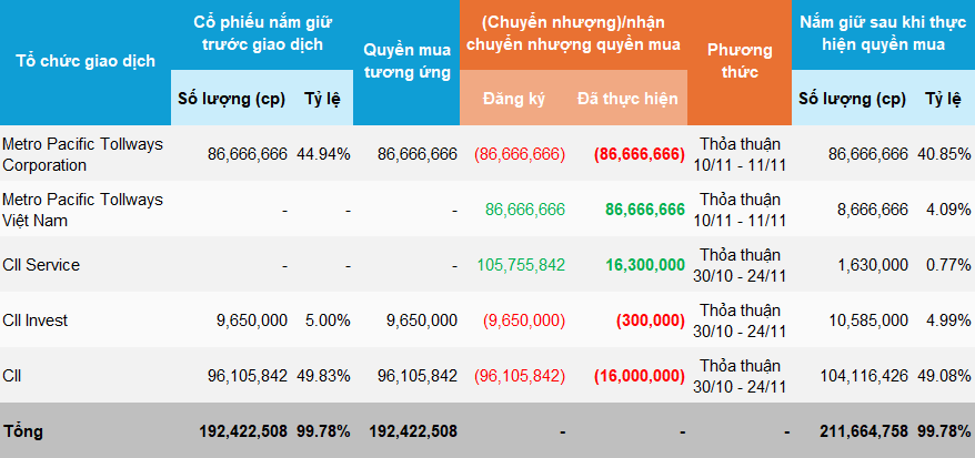 Specifically, CII Service and Investment Company LLC (CII Service) acquired 16.3 million warrants out of nearly 105.8 million registered. Conversely, HCMC Infrastructure Investment JSC (HOSE: CII) and CII Trading and Investment Company LLC (CII Invest) transferred 300,000 and 16 million warrants, respectively, totaling the amount received by CII Service. Notably, both CII Invest and CII Service are subsidiaries of CII.