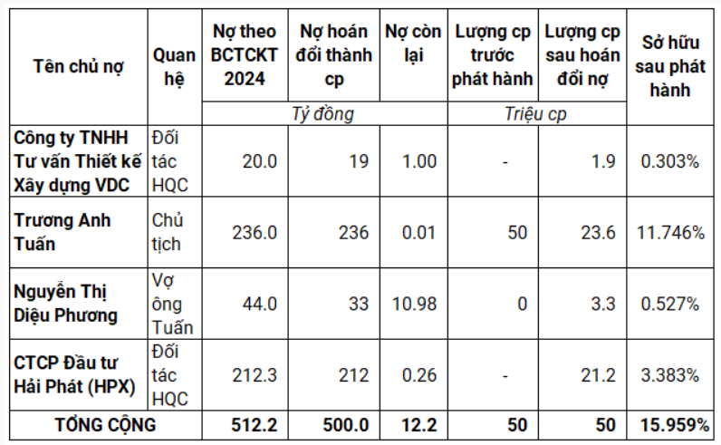 According to the previously announced list, there are 4 creditors eligible for the debt-to-equity swap, with Chairman Truong Anh Tuan and his spouse holding more than half.