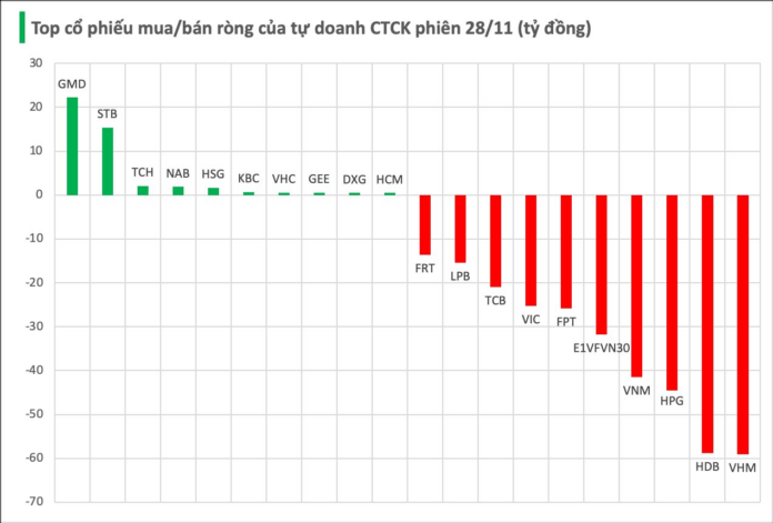 Specifically, securities firms’ proprietary trading desks were the heaviest net sellers in VHM, with a value of -59 billion VND, followed by HDB (-59 billion), HPG (-45 billion), VNM (-41 billion), and E1VFVN30 (-32 billion VND). Other stocks also saw significant net selling, including FPT (-26 billion), VIC (-25 billion), TCB (-21 billion), LPB (-15 billion), and FRT (-14 billion VND).