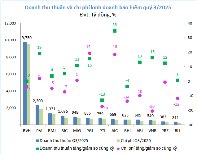 In terms of growth rate, MIG saw the most significant increase, with profits nearly five times higher than the previous year. PRE and BMI followed with 3.3 and 3.2 times growth, respectively. Notably, VNR, ABI, and BLI, which incurred losses in Q3 last year due to Typhoon Yagi, successfully turned their fortunes around, achieving substantial profits this quarter.