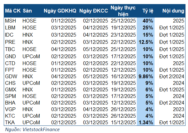 The highest dividend payout for the upcoming week is by MSH (May Sông Hồng), as an advance dividend for 2025. With a 40% rate and over 112.5 million outstanding shares, the company is expected to disburse approximately 450 billion VND. The ex-dividend date is December 1, with payment starting from December 25, 2025.