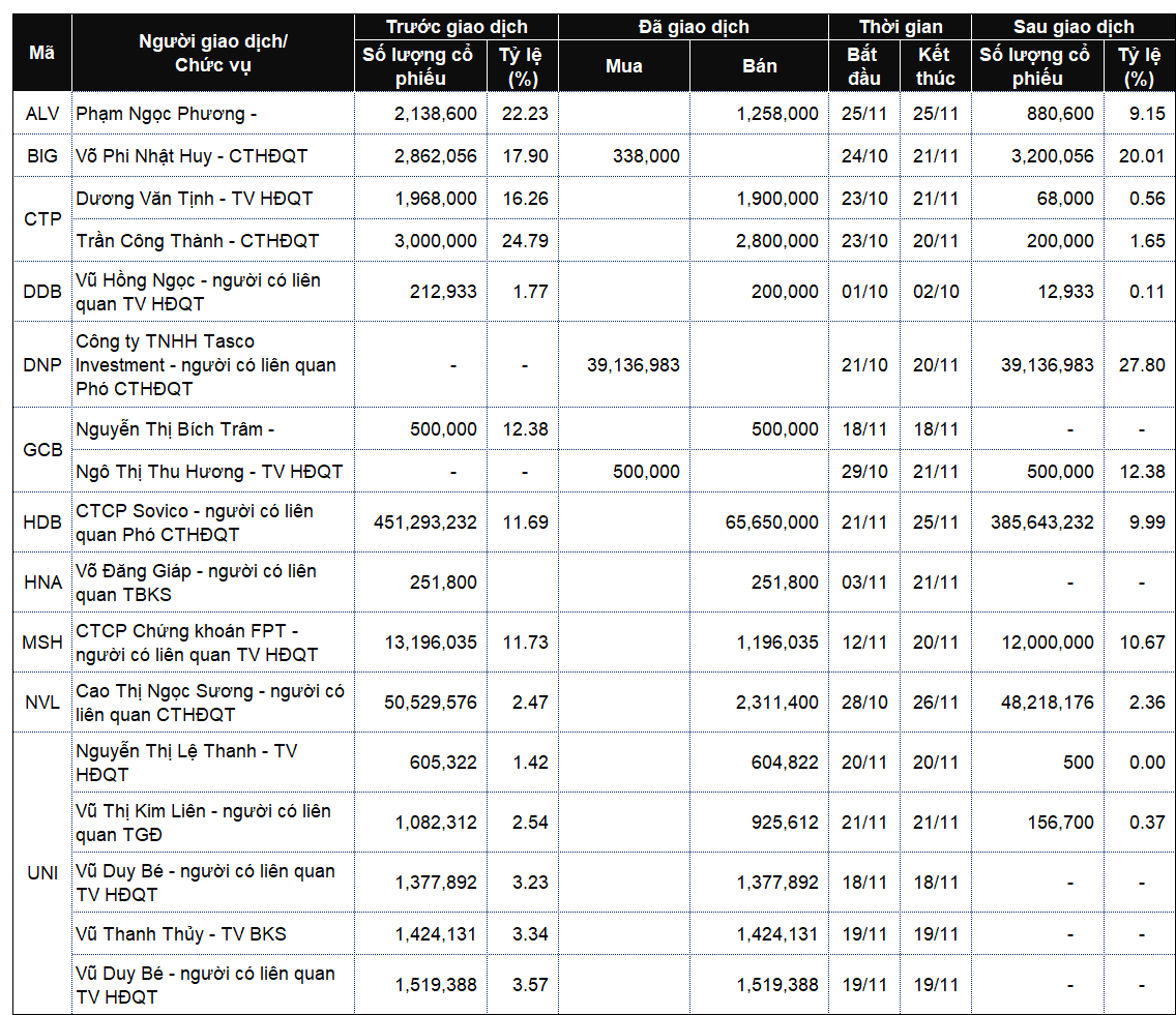 Simultaneously, Mr. Dương Văn Tịnh, a Board Member and CEO, also sold 1.9 million shares, lowering his stake from 16.26% to 0.56% (equivalent to 68,000 shares). Mr. Tịnh’s transactions concluded on November 21, one day after Mr. Thành’s, and both executives are no longer major shareholders of the company.