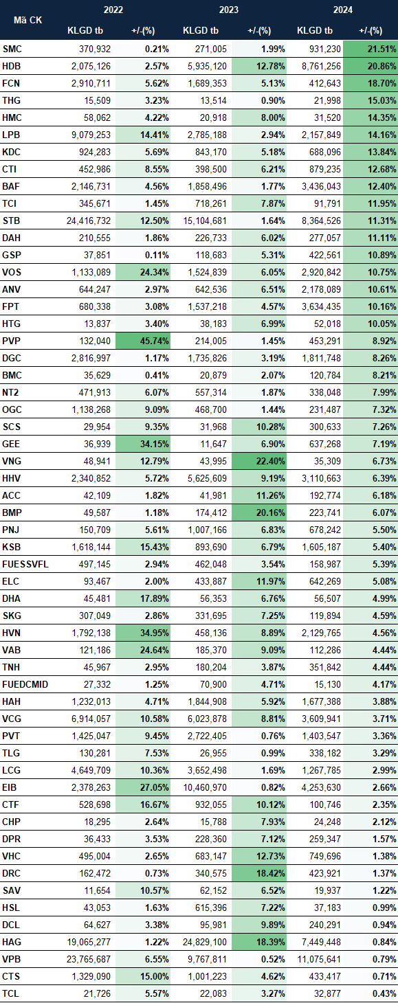 Conversely, 15 stocks typically decline during this period, including leading companies like NVL in real estate, GAS in energy, and VCB in banking.