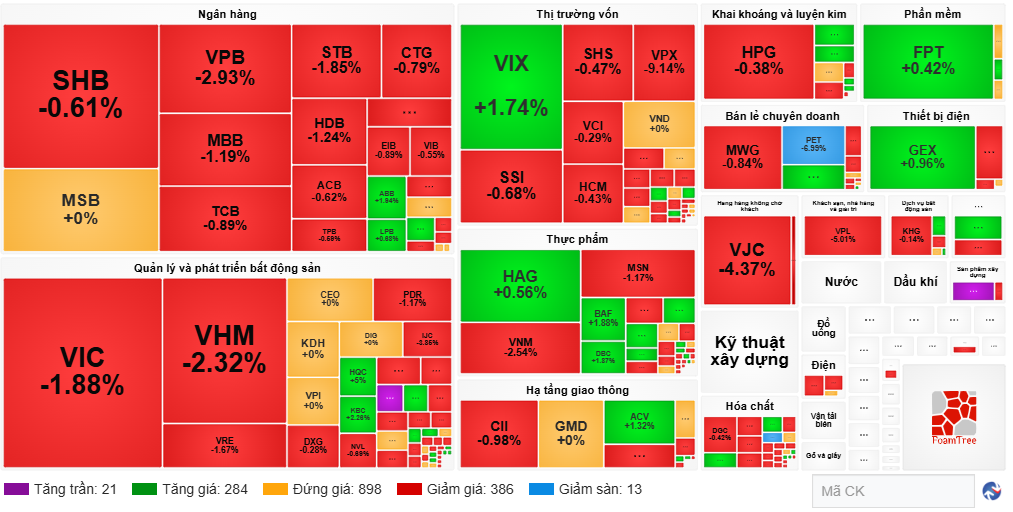The securities sector also saw widespread declines, with SSI (-0.68%), HCM (-0.43%), VCI (-0.29%), SHS (-0.47%), and newcomer VPX (-9.14%) on its first trading day on HOSE. VIX (+1.74%) was among the rare gainers in this group.