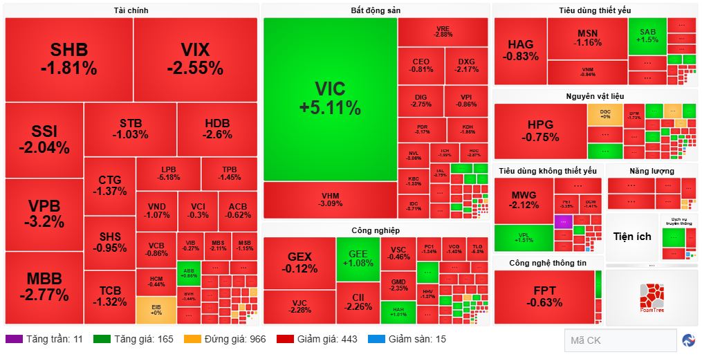 Financials opened in red, with SSI, VIX, MBB, HDB, SHB, VPB, SHS, TCB, STB, and VCB declining, pressuring the index.