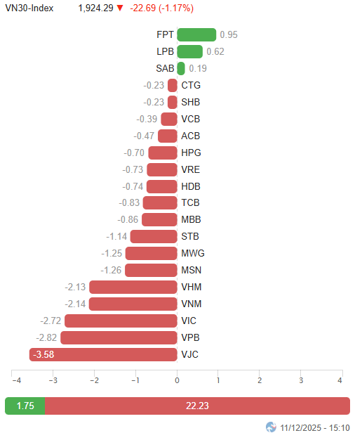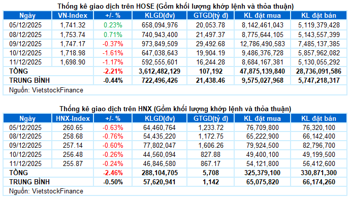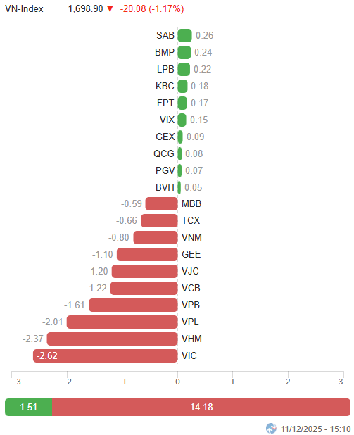 – The market extended its correction in the December 11 session under strong pressure from the pillar group right from the start. Vingroup stocks remained the dominant factor, weighing heavily on the VN-Index and making the recovery efforts of the rest seem fragile. The overall market remained polarized with a fairly balanced breadth, but liquidity continued to decline, reflecting investors’ cautious sentiment amid significant fluctuations in leading stocks. The VN-Index failed to hold the psychological threshold of 1,700 points, closing with a 1.17% decrease compared to the previous session, at 1,698.9 points.