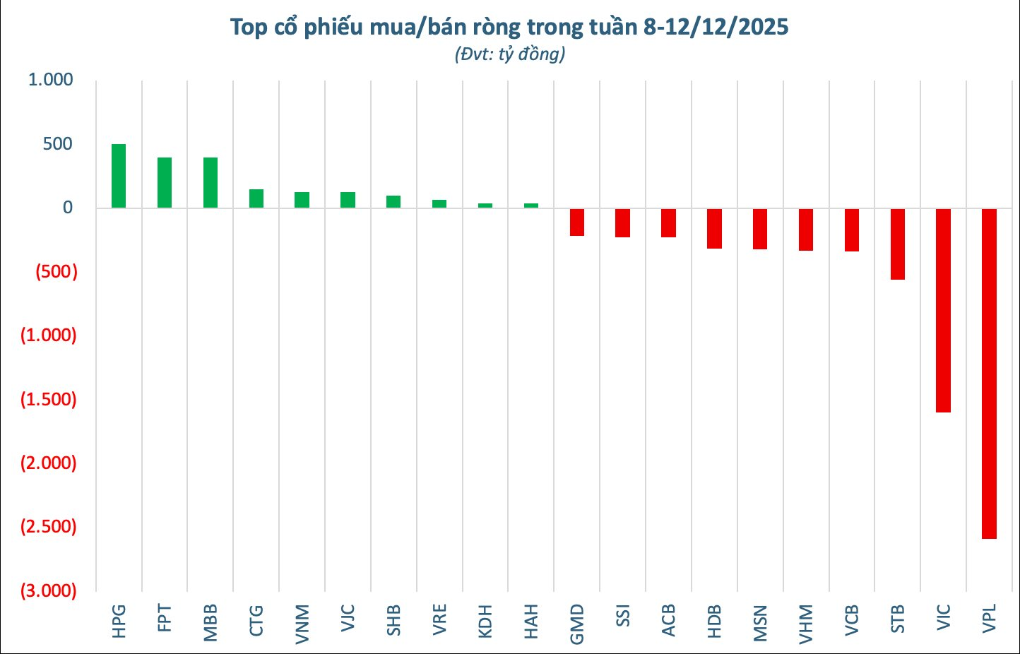 In terms of individual stocks, VPL was the most heavily sold, with net outflows of VND 2,588 billion, far exceeding other stocks. VIC followed with VND 1,597 billion in net selling, followed by STB (VND 557 billion) and VCB (VND 338 billion). Other large-cap stocks facing significant outflows included VHM (VND 330 billion), MSN (VND 320 billion), HDB (VND 314 billion), ACB (VND 230 billion), SSI (VND 227 billion), and GMD (VND 217 billion).