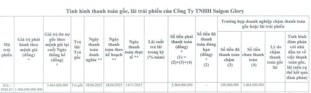 According to a report submitted to the Hanoi Stock Exchange (HNX) on November 14, 2025, Saigon Glory failed to make a timely interest payment of approximately VND 3.5 billion due on June 18, 2025, for its CGL-2020.02 bond issuance.