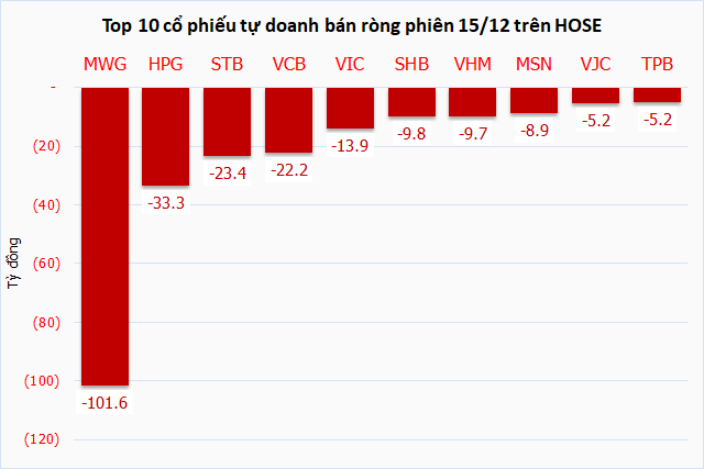 During the December 15th session, proprietary trading desks net sold VND 60 billion on the HOSE exchange. The most heavily sold stock was NAB, with a value of VND 47 billion, followed by VIX, HHS, and VRE. Conversely, MWG saw the largest net selling, reaching nearly VND 102 billion.