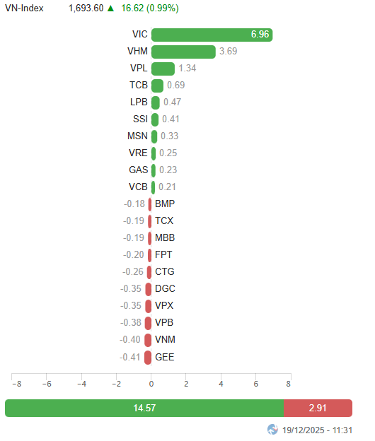 Leading stocks continued to drive market gains in the final morning session. At the midday break, the VN-Index rose over 16 points (+0.99%) to 1,693.6 points, while the HNX-Index increased by 0.34% to 254.08 points. Market breadth was balanced, with 343 decliners and 299 advancers.