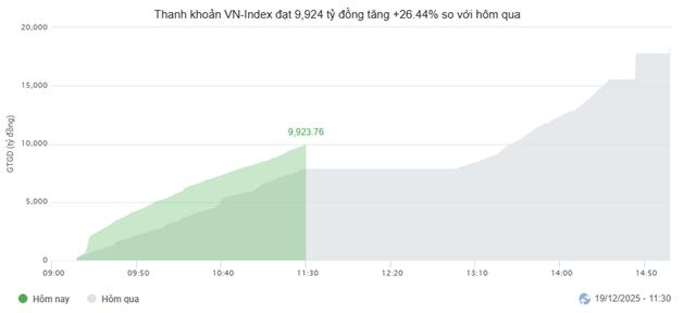 Market liquidity showed signs of improvement compared to the previous session. HOSE trading value reached over 9.9 trillion VND, up 26.44% from the same period yesterday, largely due to a surge in DGC trading, with over 31 million shares changing hands in just half a day. Similarly, HNX trading volume also rose significantly, with over 37 million units traded, equivalent to over 616 billion VND.