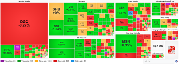 Green dominated among VN30 stocks, with VIC, VHM, TCB, and LPB supporting the market by contributing over 9.9 points to the index. Conversely, FPT, VNM, VJC, and DGC faced selling pressure, reducing the index by nearly 2 points.
