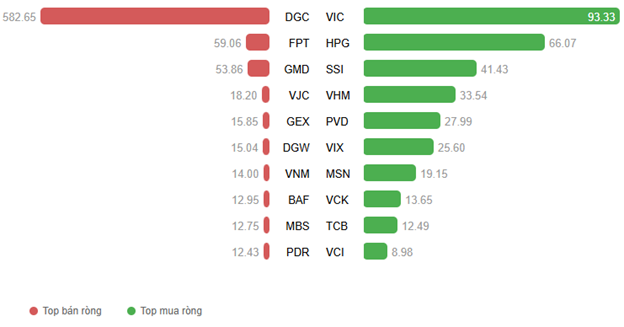 Foreign investors continued net selling with over 596.2 billion VND across all three exchanges. Selling pressure was concentrated in DGC, with a value of 582.65 billion VND, far exceeding other stocks. Conversely, VIC and HPG led net buying with values of 93.33 billion and 66.07 billion, respectively.
