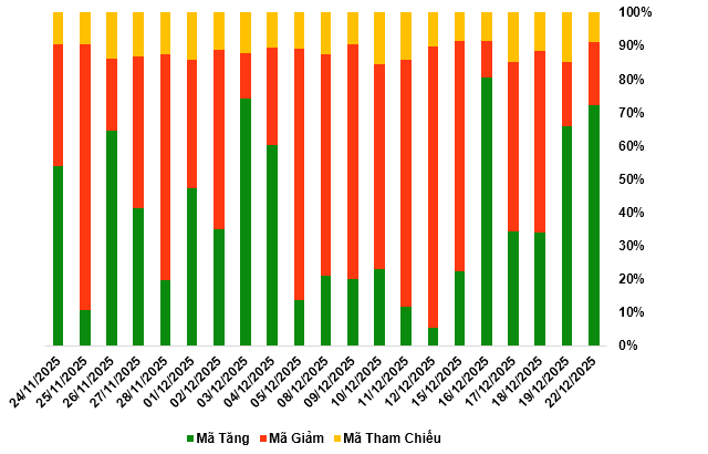 By the close of trading on December 22, 2025, the market recorded 190 advancing codes, 52 declining codes, and 21 reference codes.