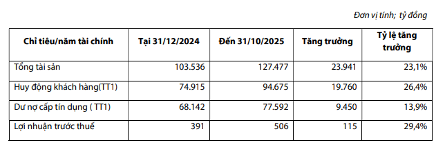 According to the report, BVBank announced that its pre-tax profit for the first 10 months of 2025 reached VND 506 billion, achieving 92% of the annual target of VND 550 billion. As of October 31, 2025, the bank’s total assets stood at VND 127,477 billion, a 23% increase from the beginning of the year. Customer deposits reached VND 94,675 billion (+26%), and outstanding loans amounted to VND 77,592 billion (+14%).